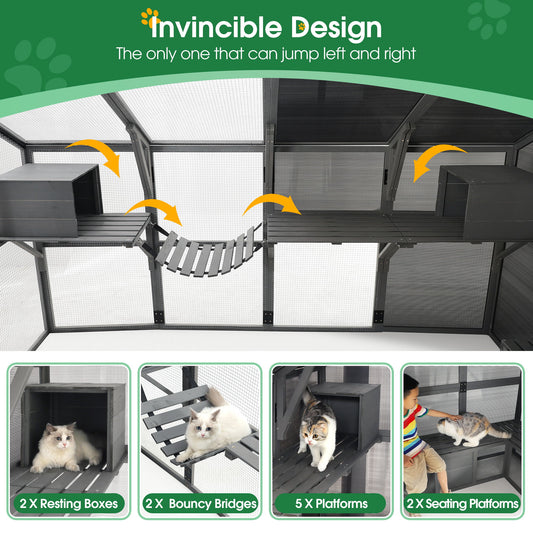 Luxury Cat Cage Outdoor Wooden Catio Enclosure Patio Large Cat Run House For Multiple Pets Walk In Kitten Kennel With Bouncy Bridge, Platforms, Small Houses, Seating And Sunshine Panel - Gray