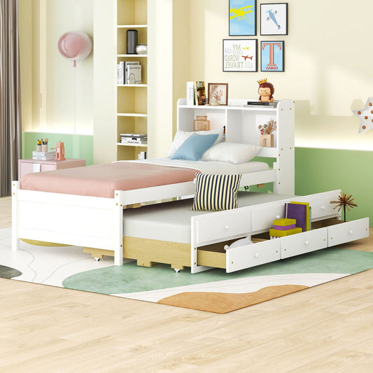 Bed With Built-In USB, Type-C Ports, LED Light, Bookcase Headboard, Trundle And 3 Storage Drawers, Bed With Bookcase Headboard, Trundle And Storage Drawers - Espresso
