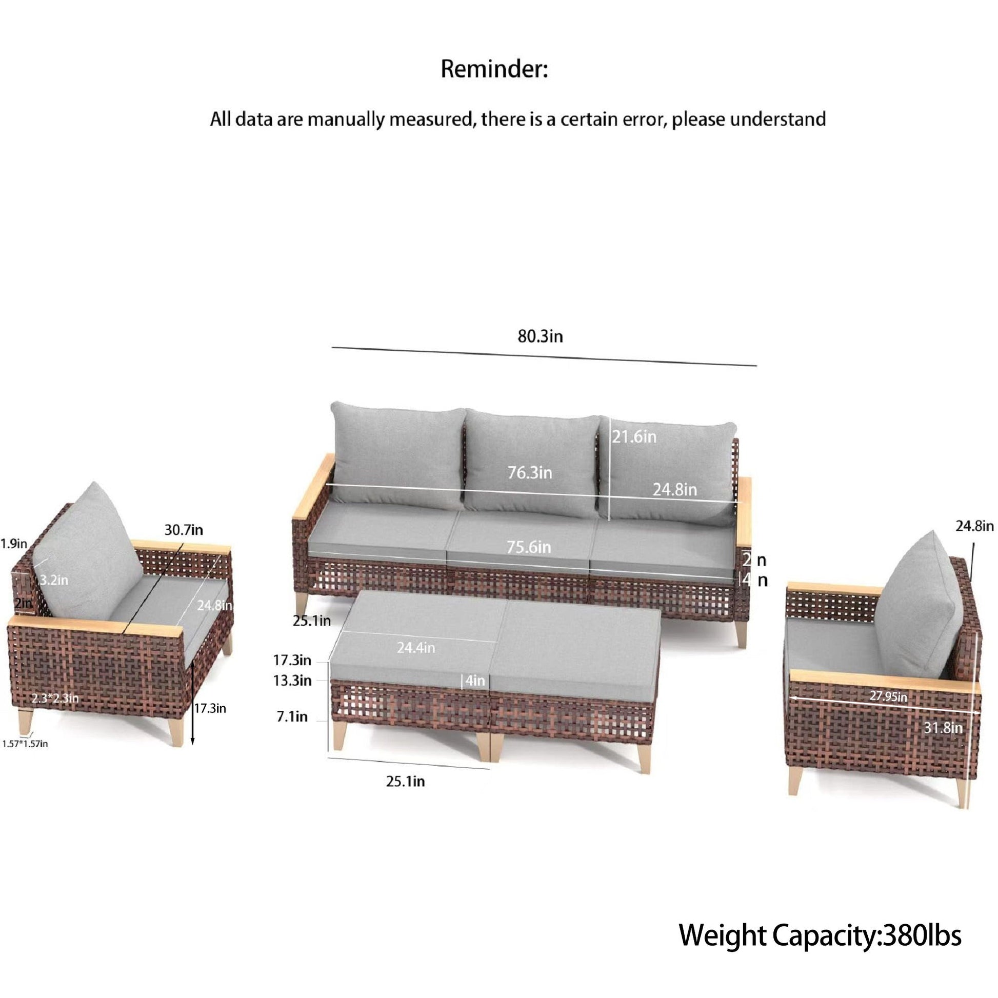 Rattan Terrace Furniture Set, 5 Piece, 7 Seats Cushions, Wooden Armrests, High Footed Design - Gray