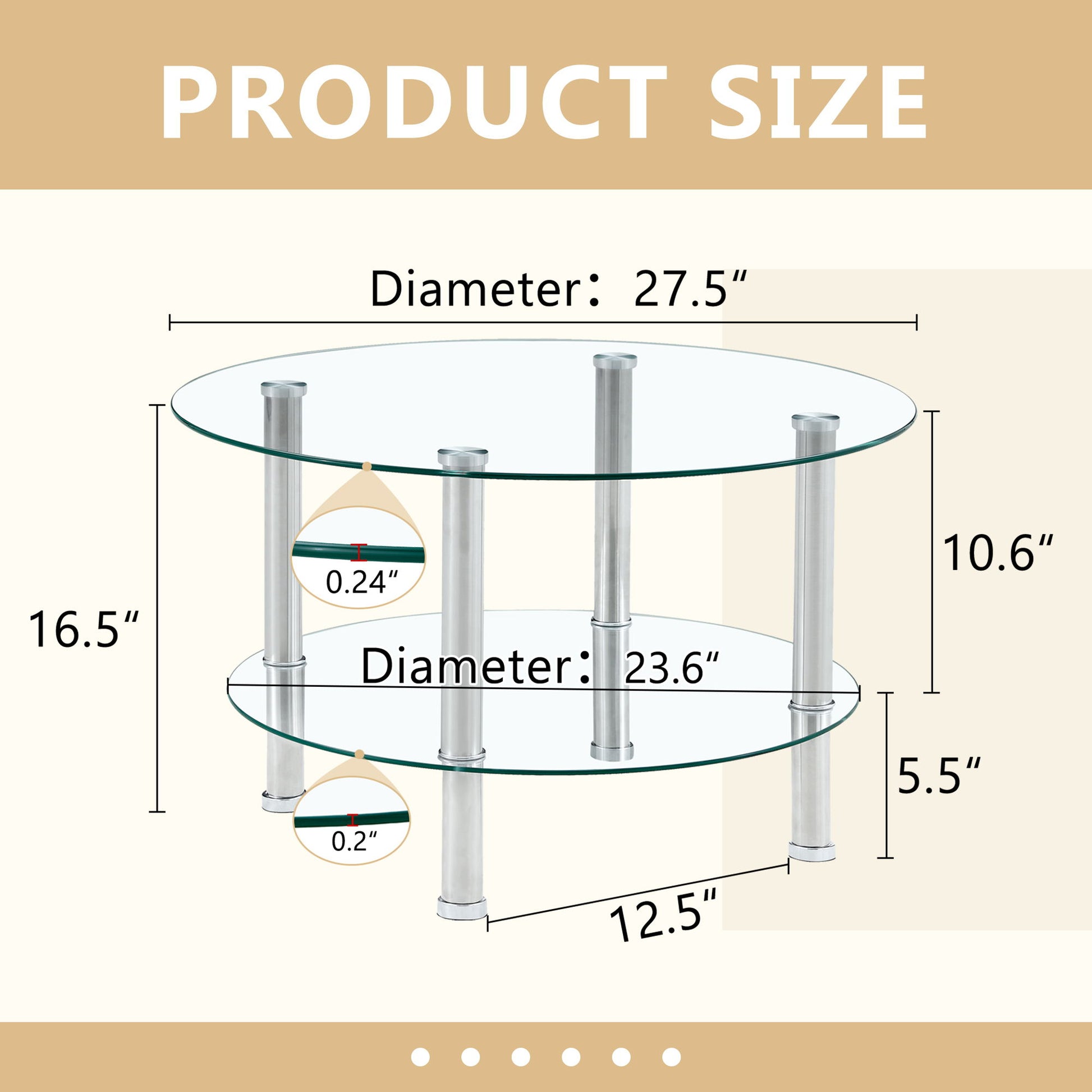 - Clear Tempered Glass: Double layer tabletop made of clear tempered glass, with top and bottom layers measuring 27.5" and 23.6" in diameter.