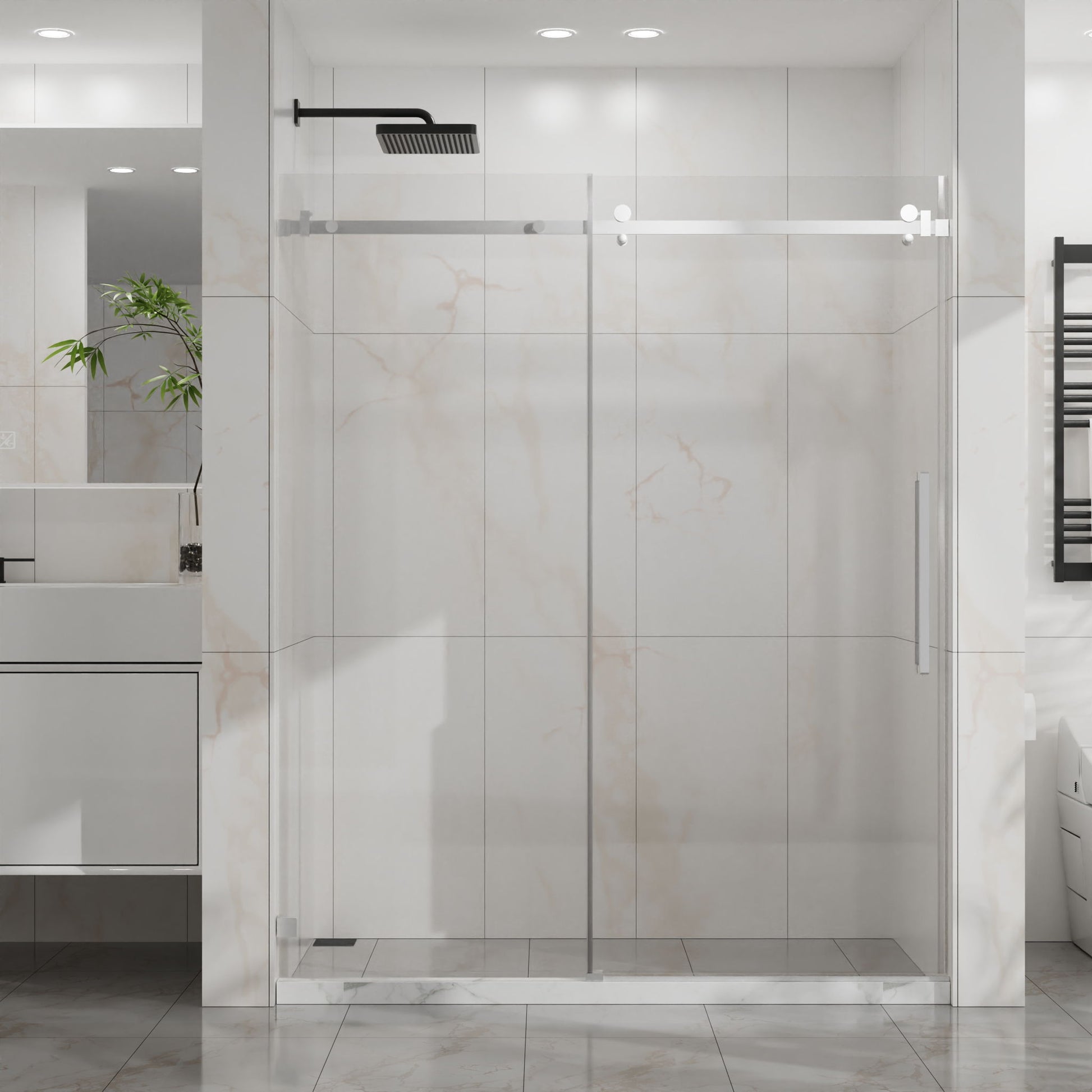 Frameless Shower Door, Silent Sleek Sliding Glass Door, Tempered Glass - Chrome