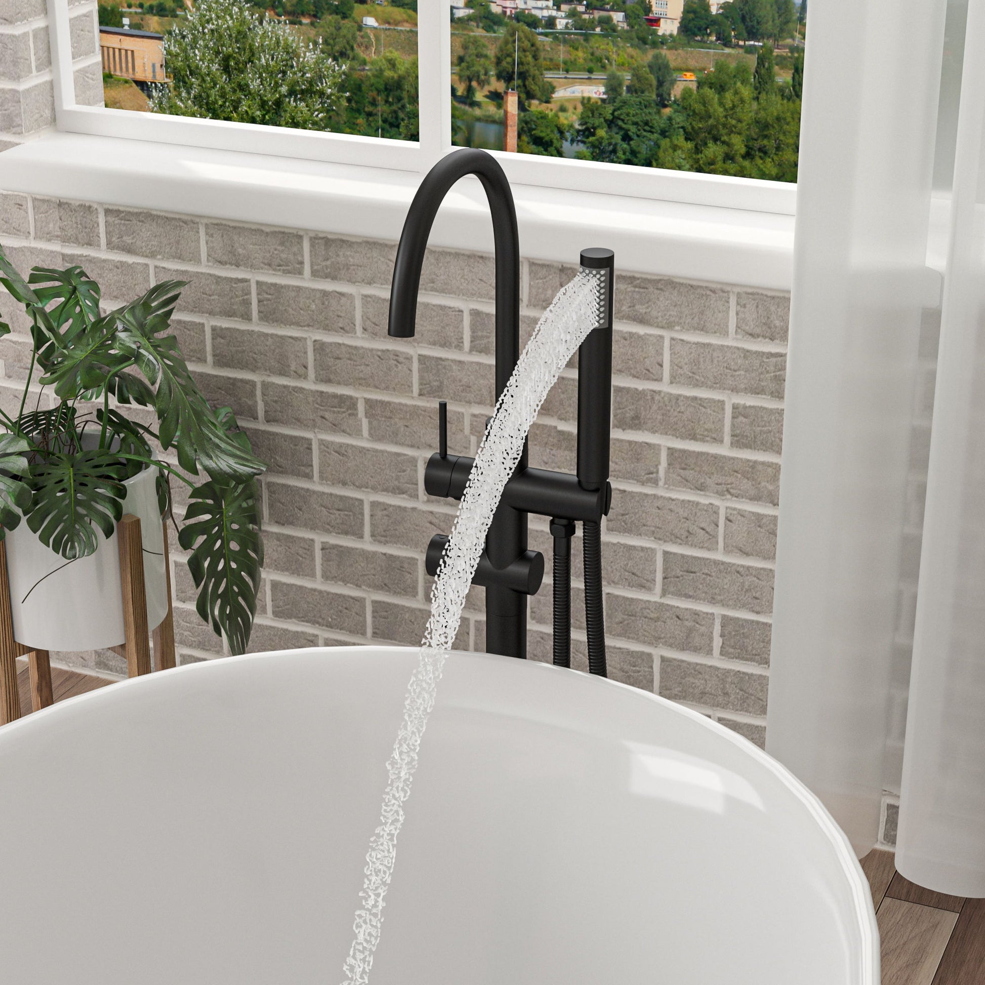Freestanding Bathtub Faucet Floor Mount Tub Filler With Swivel Gooseneck Spout And Cylinder Handheld