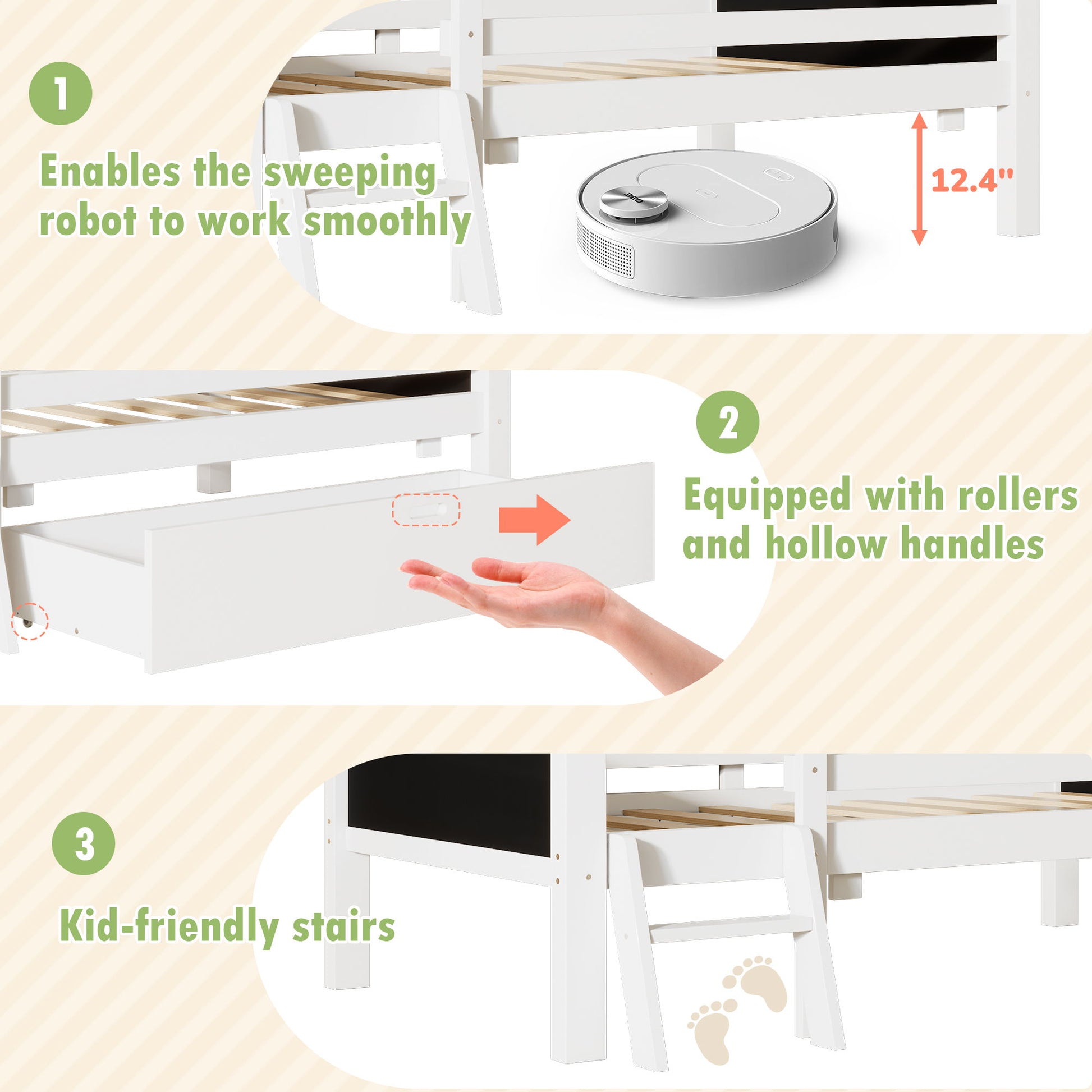 Twin Size House Bed With Ladder, Storage Drawers, And Blackboard Design - White