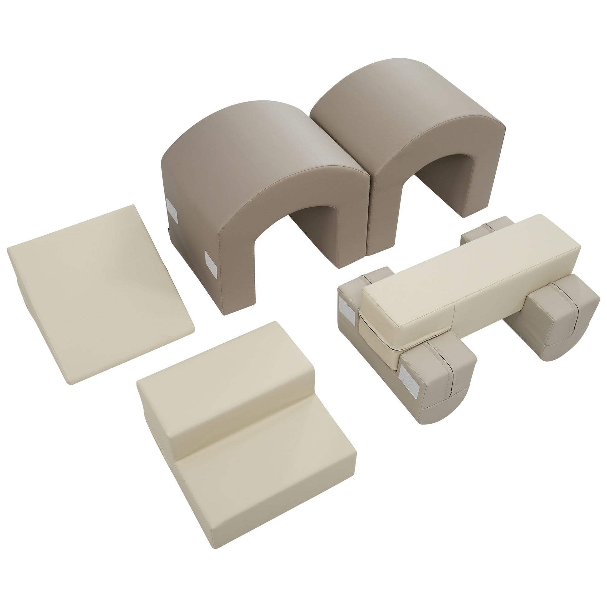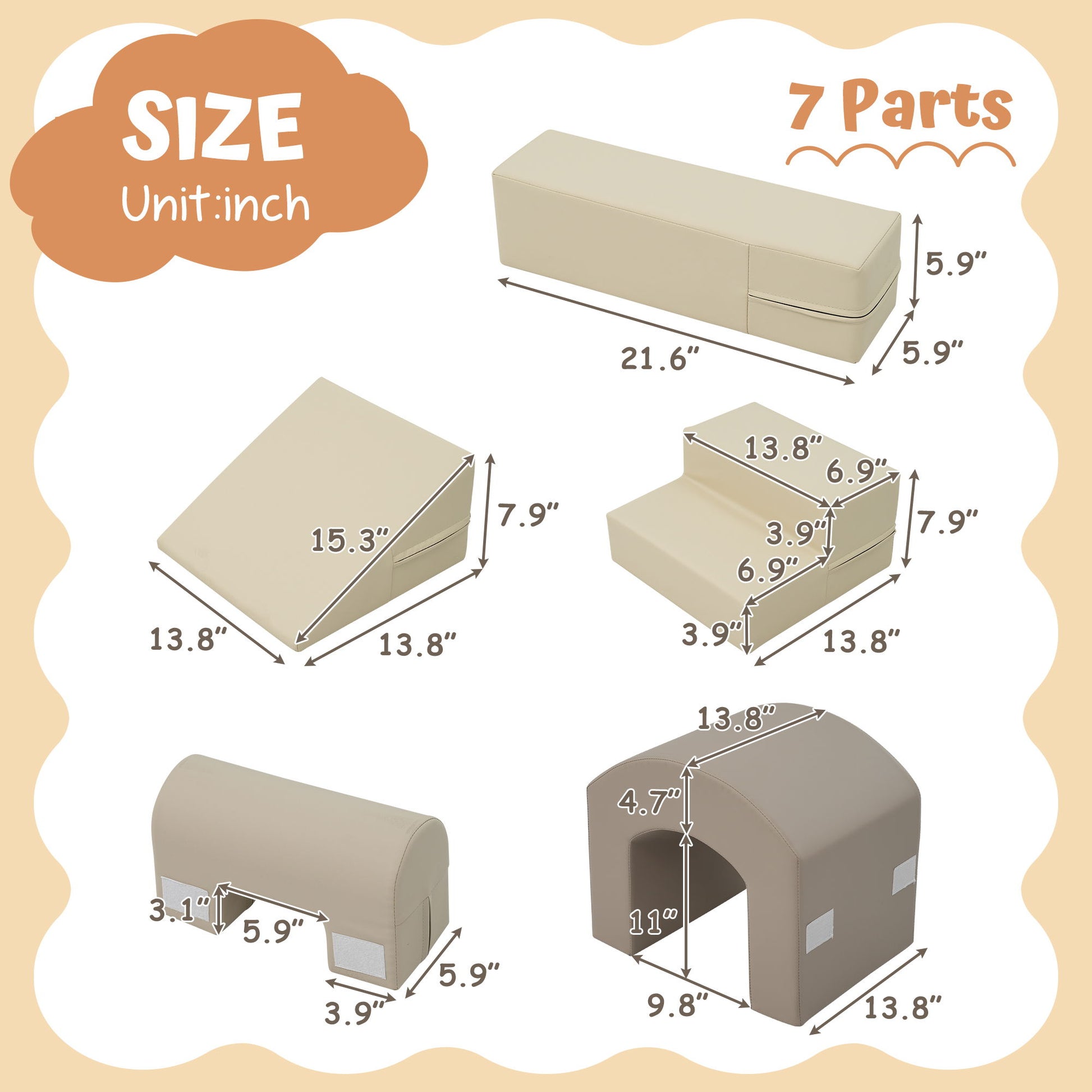 Indoor Soft Foam Climber Play Sets 7 In 1, Soft Play Equipment Climb And Crawl Playground For Toddlers, Kids Crawling And Climbing Active Play Structure - Coffee