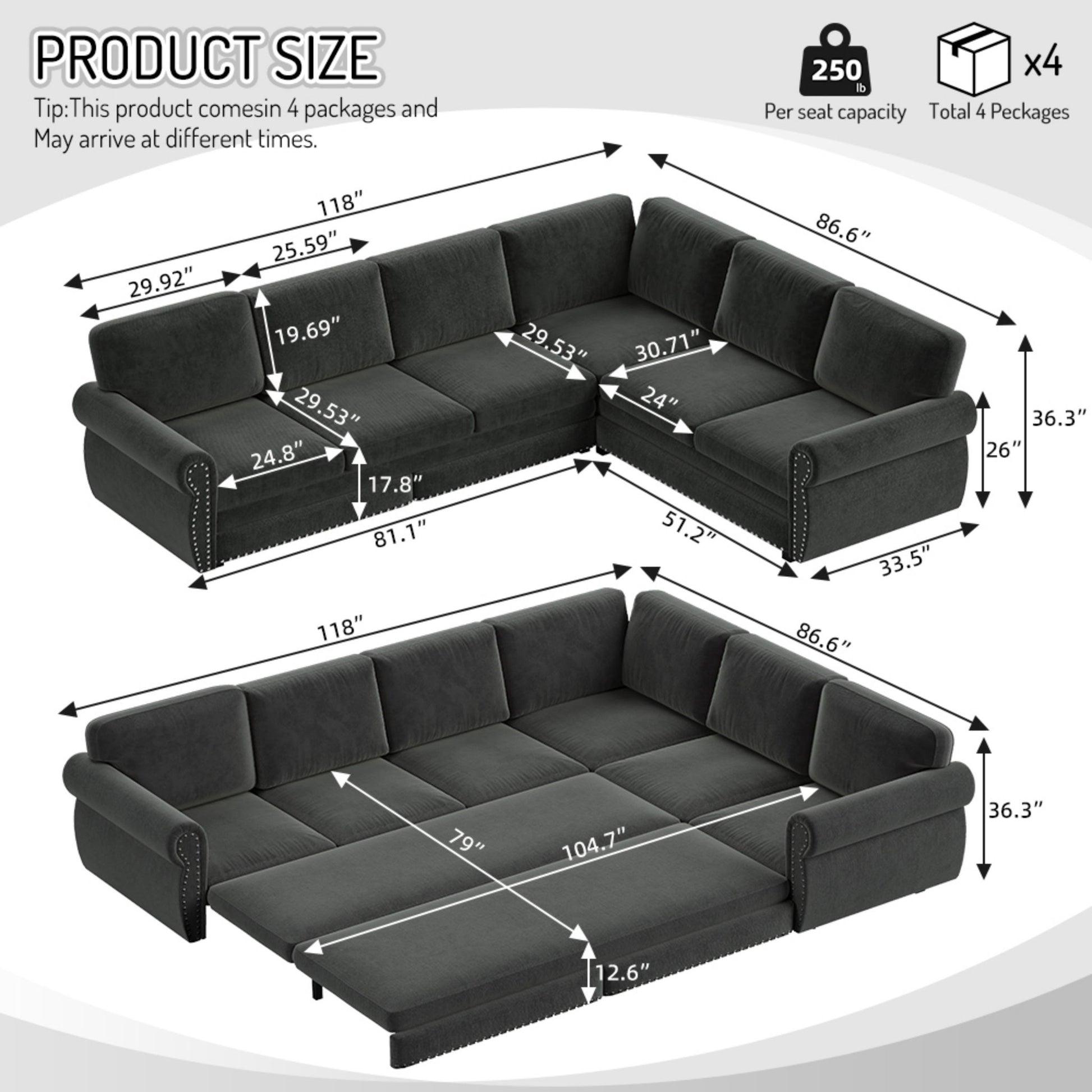 L-Shaped Sofa Couch With Pull Out Bed With Nailhead Trim & Rolled Arm, Sectional Couches, For Living Room - Dark Gray