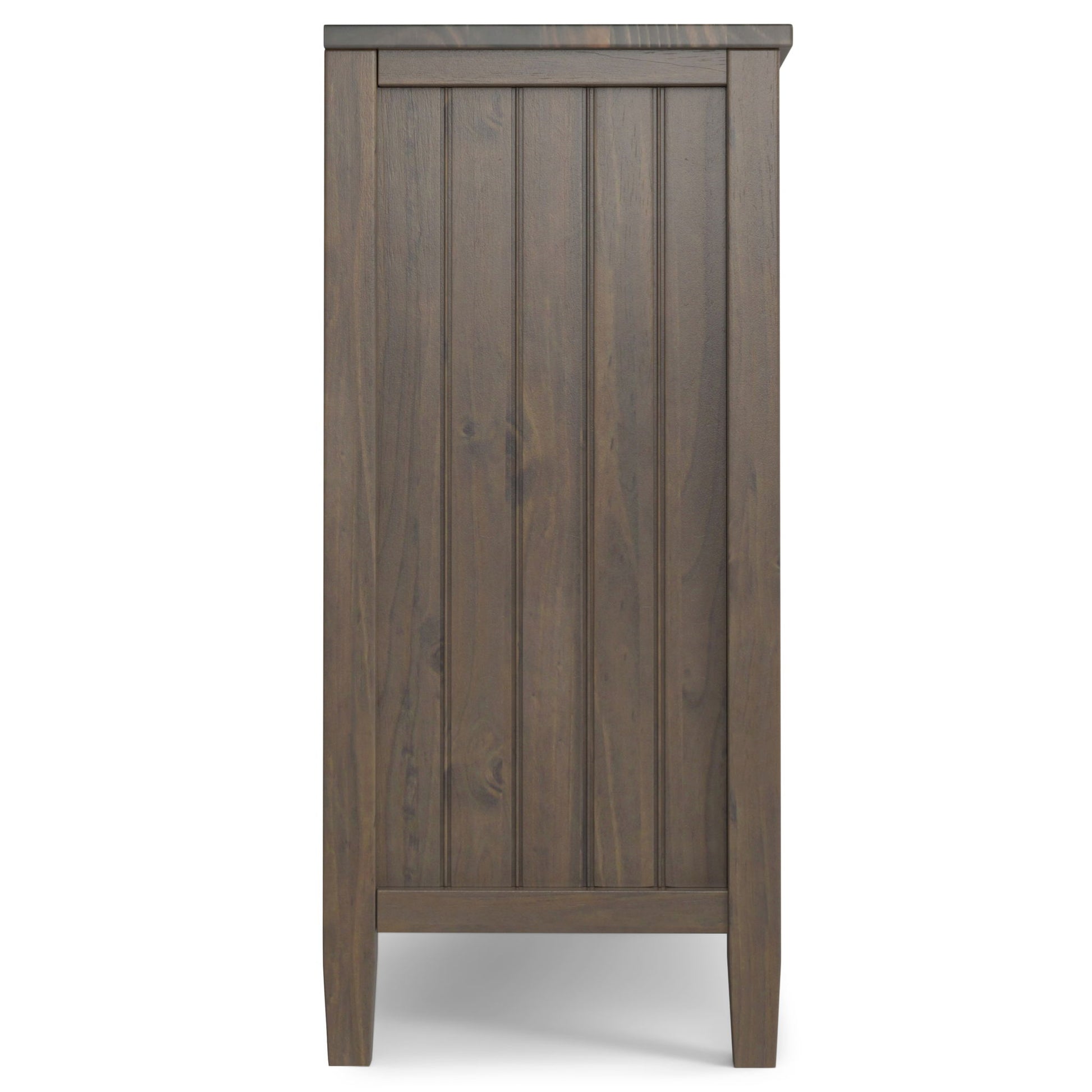 - Transitional design includes grooved detail on front doors, sides, brushed bronze handles, square tapered legs and square edged table top