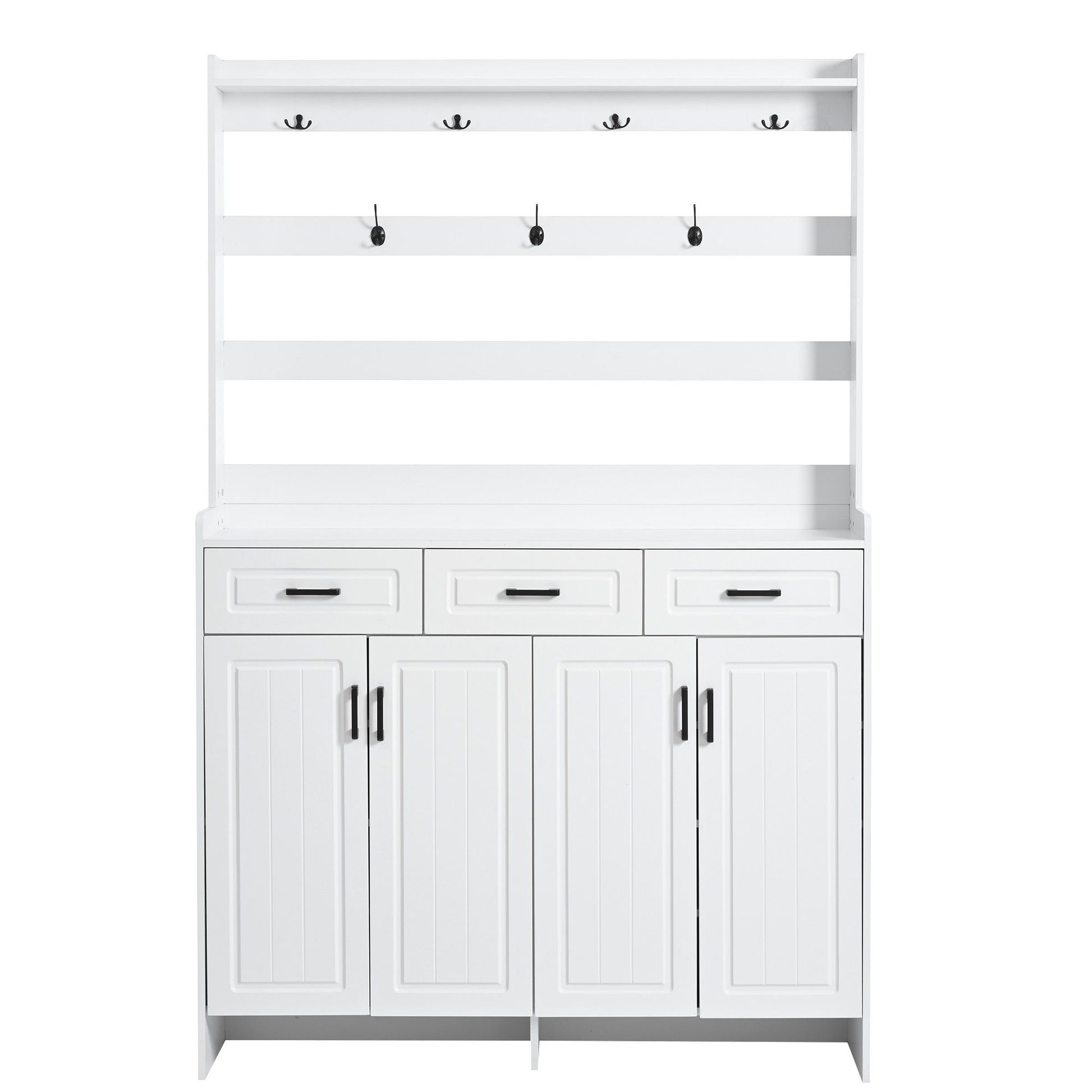 Minimalist 4 Door Shoe Cabinet With Coat Rack, Spacious Top, 3 Drawers, 8 Shelves, Metal Hooks And Handles For Hallway - White