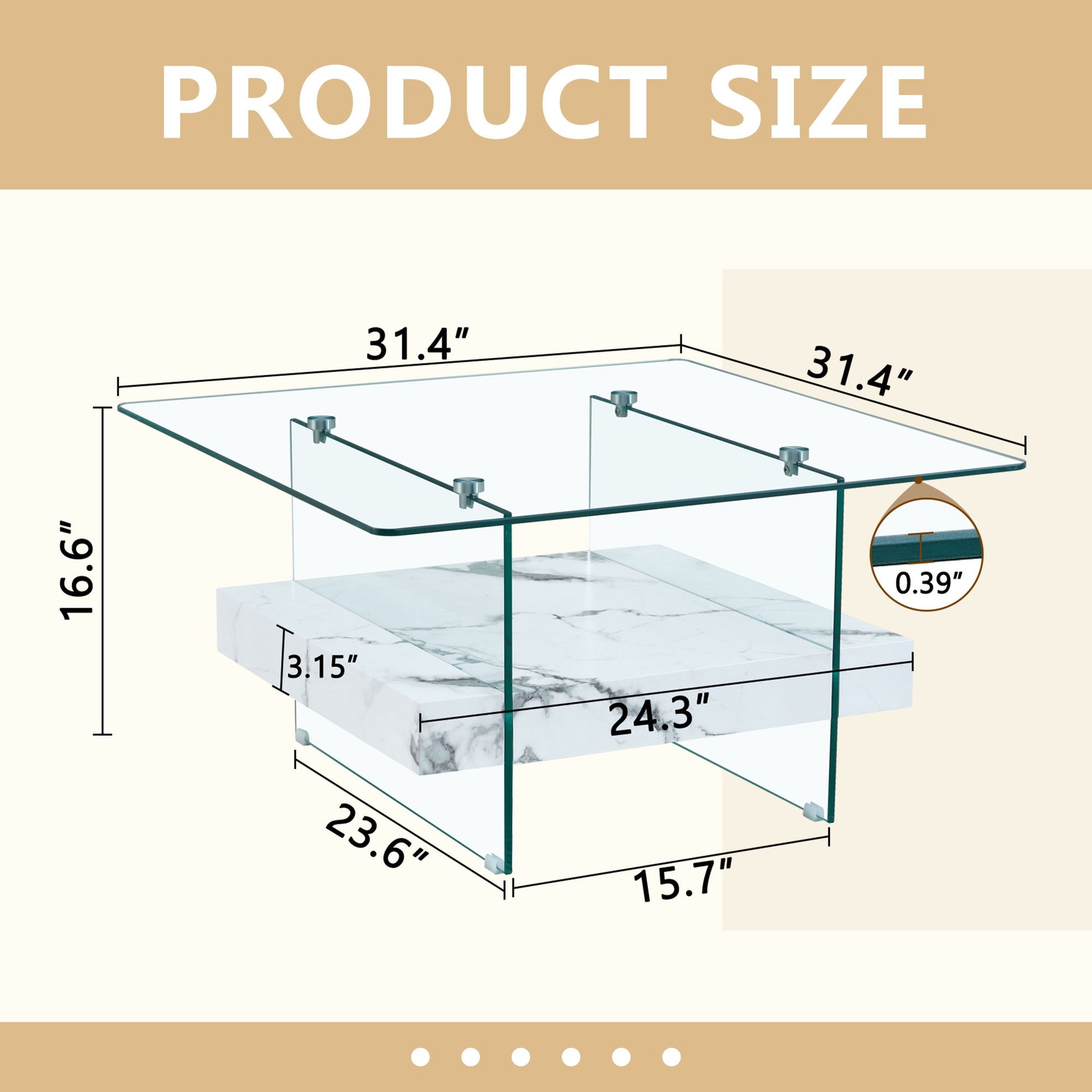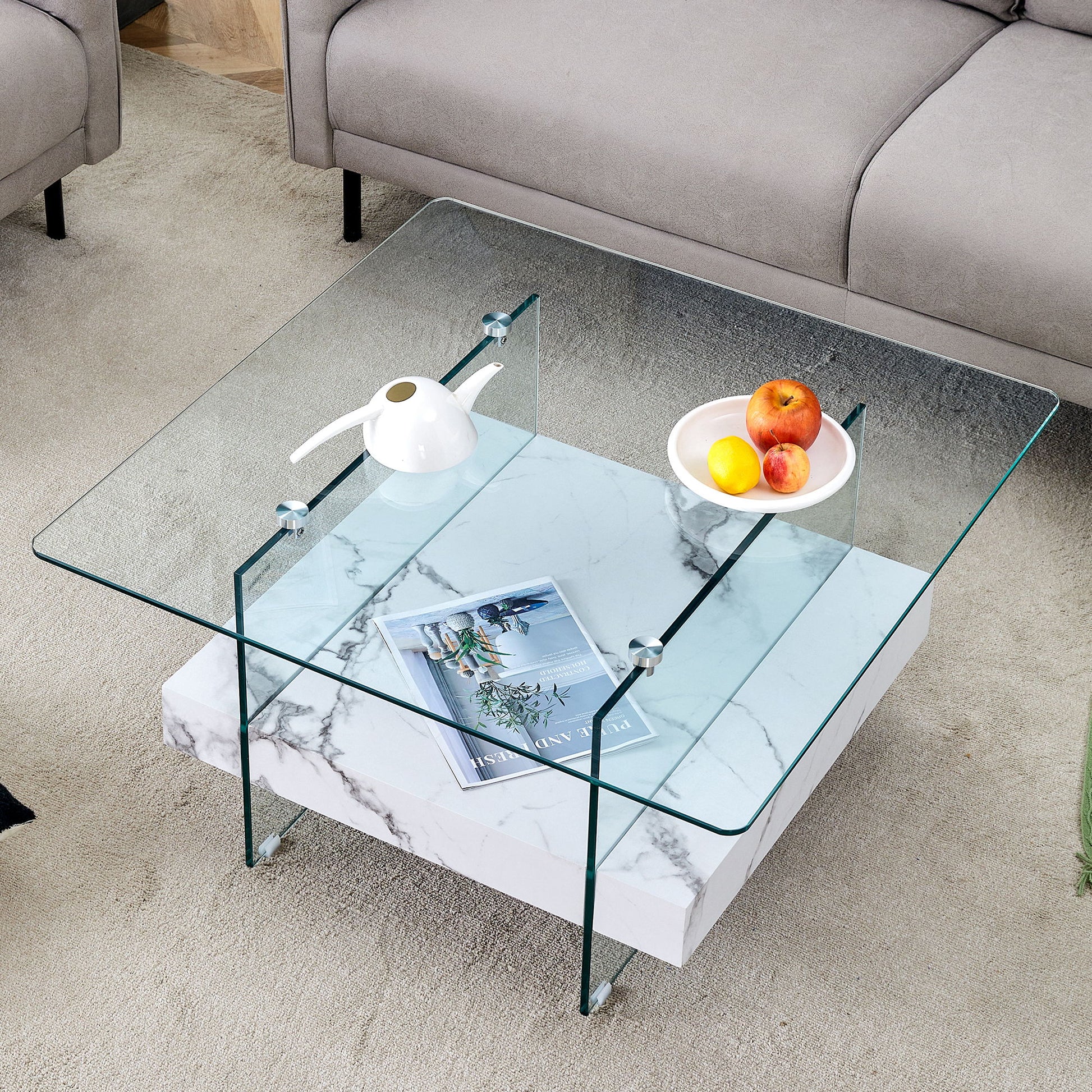 Modern 2 Tier Square Coffee Table With Clear Glass And Marble Pattern Sticker - Transparent / White