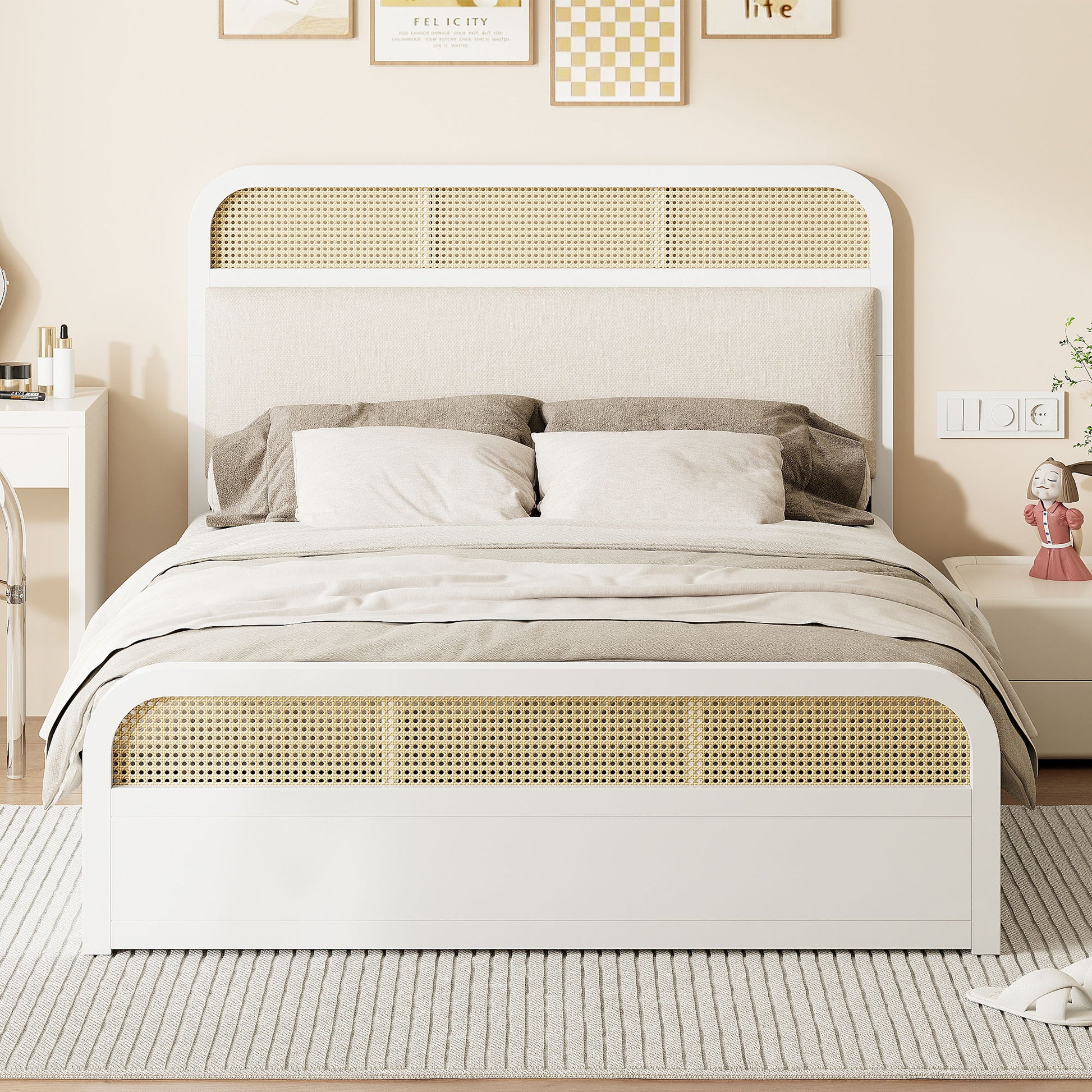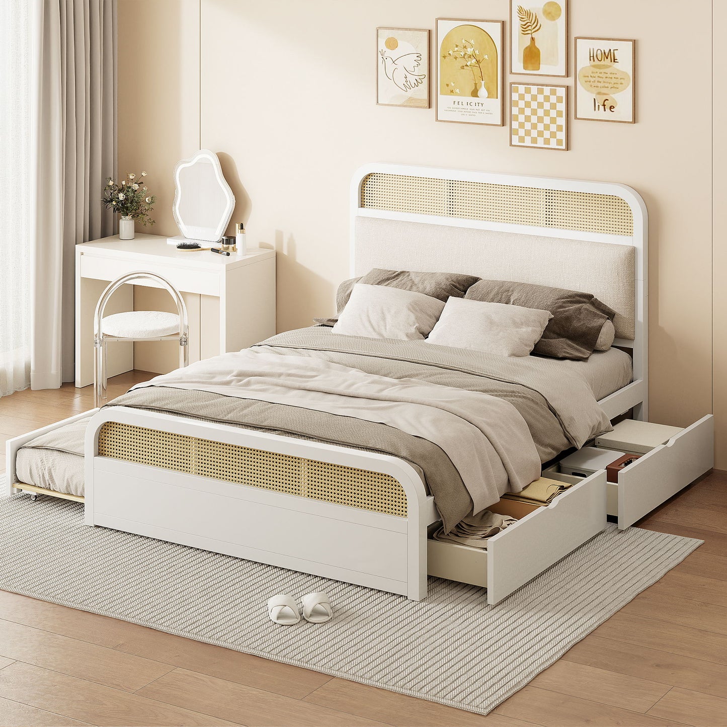 With tasteful rattan accents on both the headboard and footboard, this platform bed adds a touch of classic charm and sophistication to any decor, making it a stylish focal point in your home. The platform bed includes a twin-size trundle bed, which easily pulls out to accommodate overnight guests or provide additional sleeping space when needed. Equipped with two large drawers, this platform bed ensures ample storage for linens, pillows, and other essentials, helping you keep your space organized and clutter-free. The headboard comes with a plush, padded cushion, providing you with a cozy spot to lean back and relax whether you’re reading or unwinding.