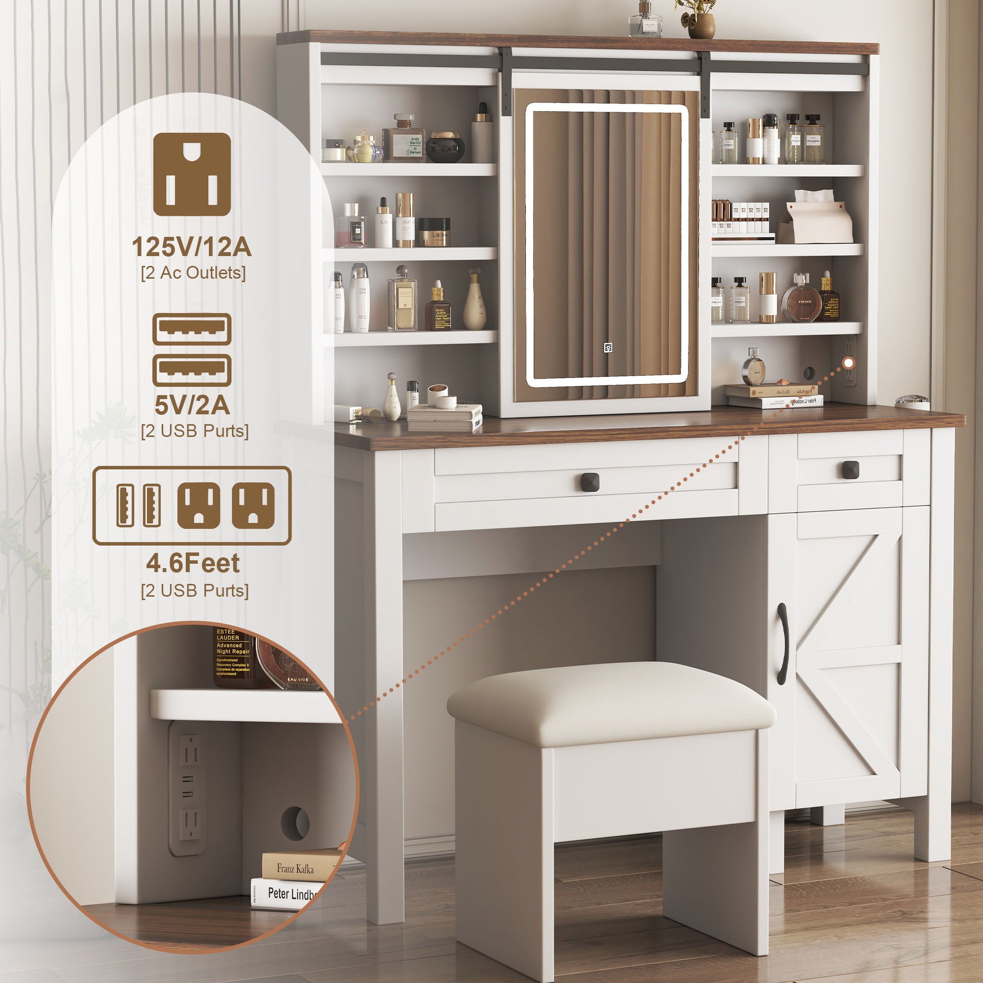 Rustic Farmhouse Makeup Vanity Desk With Sliding Mirror, LED Lights, And Charging Socket - White