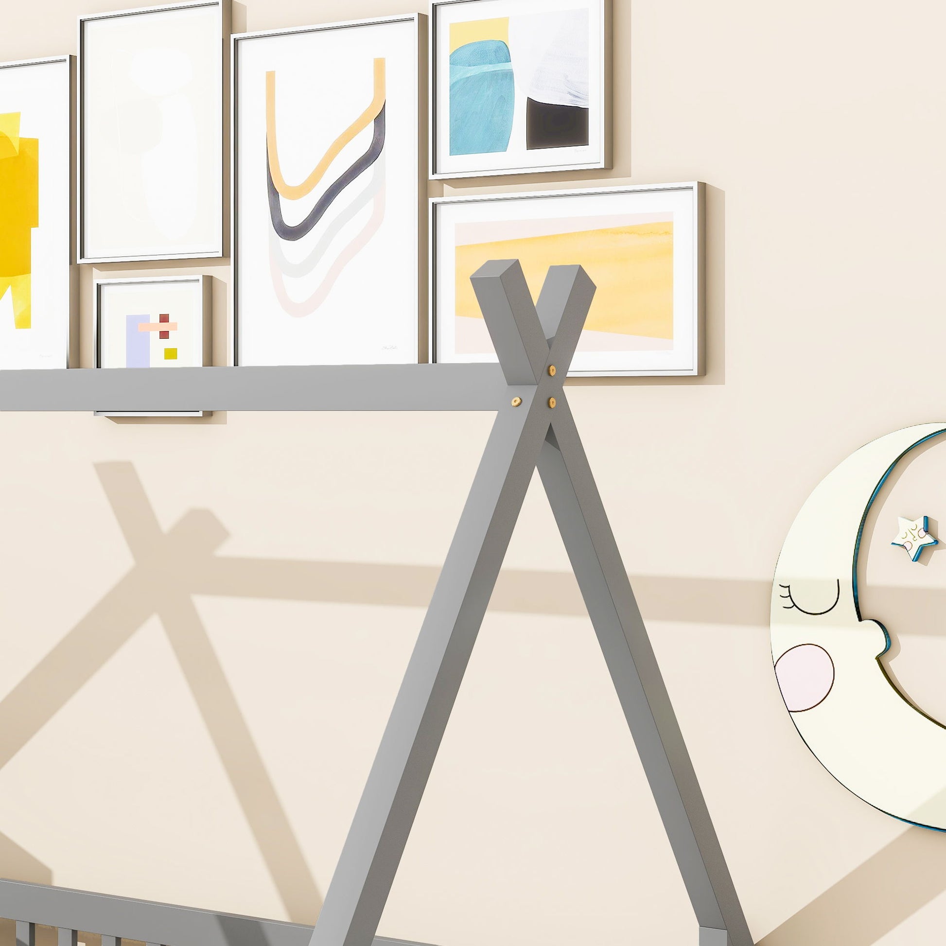 Twin Tent-Shaped Floor Bed, With Guardrails, Slats, Door - Gray