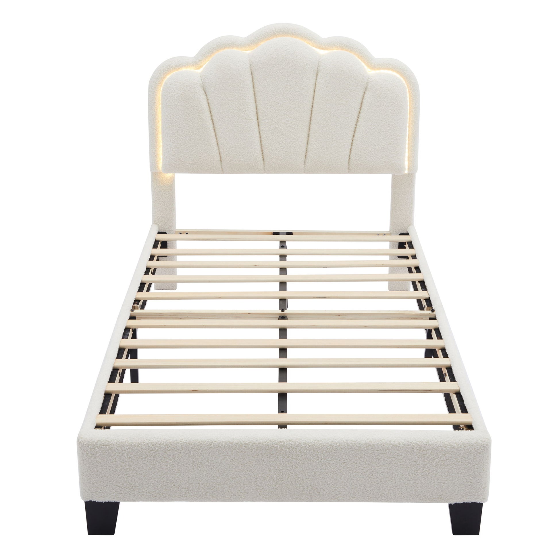 Twin Size Upholstered Flower-Shape Bed, Elegant Flowers Headboard With LED Light Strip, Sherpa Fabric Platform Bed With Slats Support - White