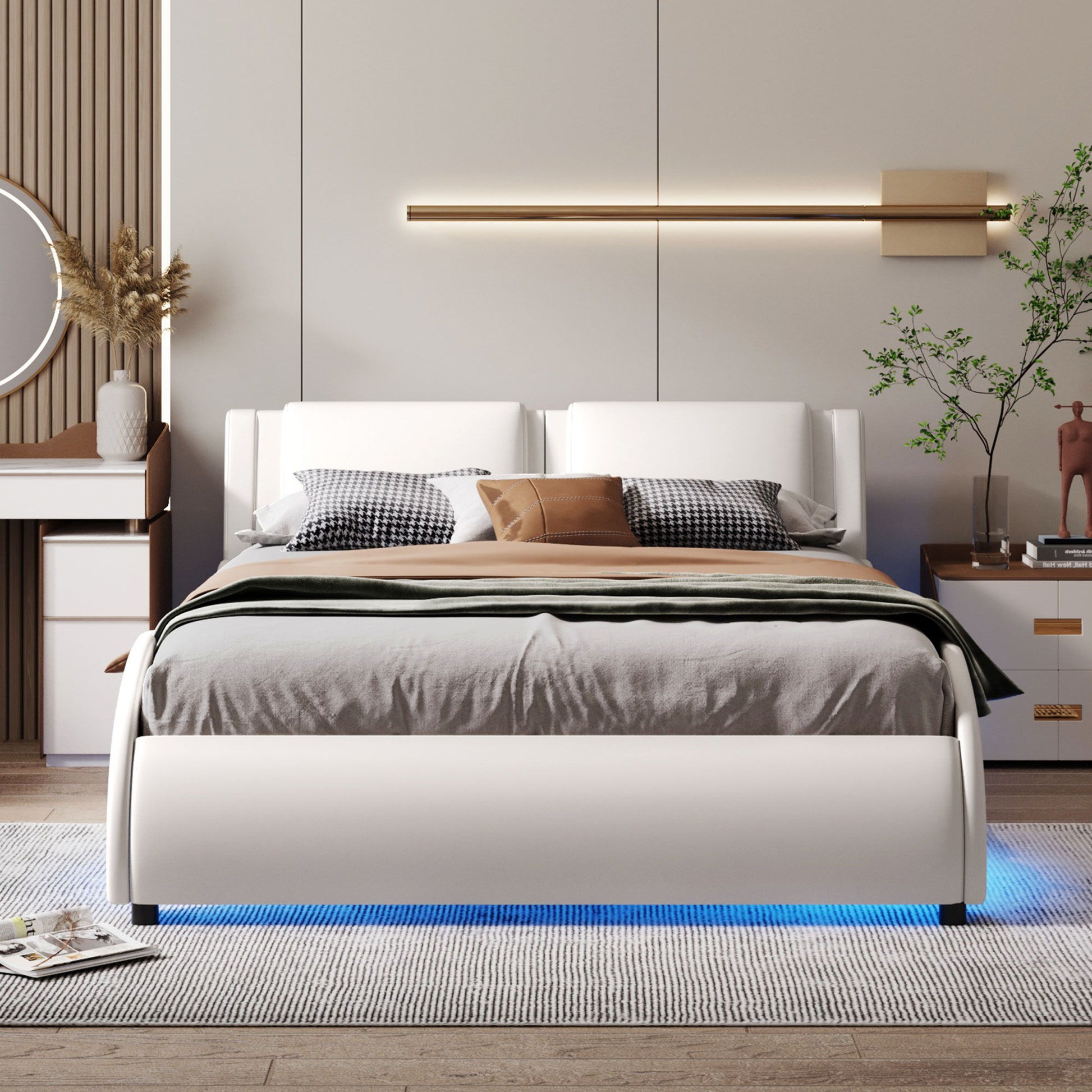 Modern LED Light Headboard Bed: The platform bed frame features RGB light bars located under the wooden frames on both sides. It includes 16 LED light colors, 10 brightness levels, and 4 lighting patterns. The colorful lighting adds vibrance to your space and can be easily controlled via remote.
