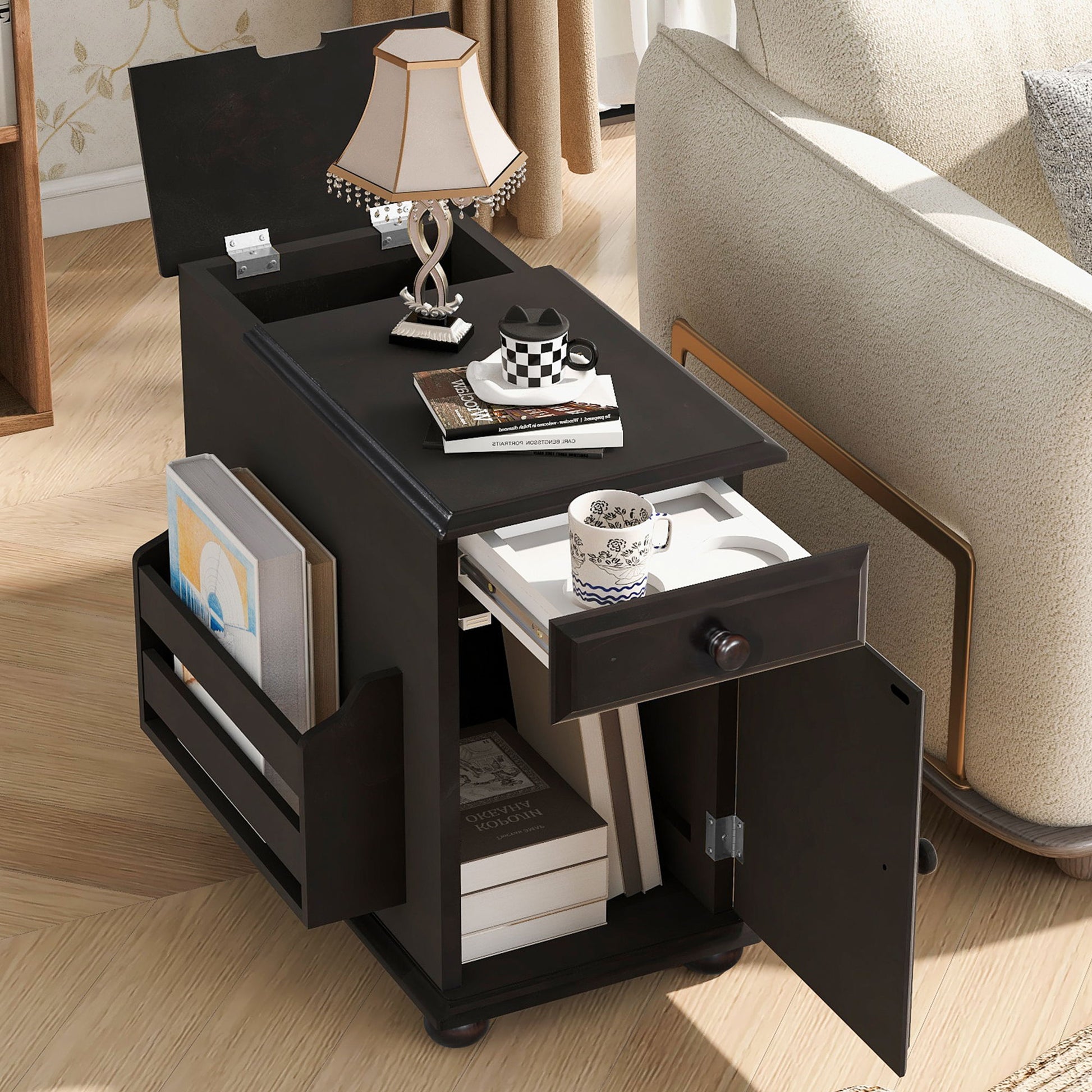 Vintage End Table Flip Top Side Table With USB Ports, 1 Multifunctional Drawer With Cup Holders, Sofa Couch Table With Bookshelf For Living Room And Small Space - Espresso