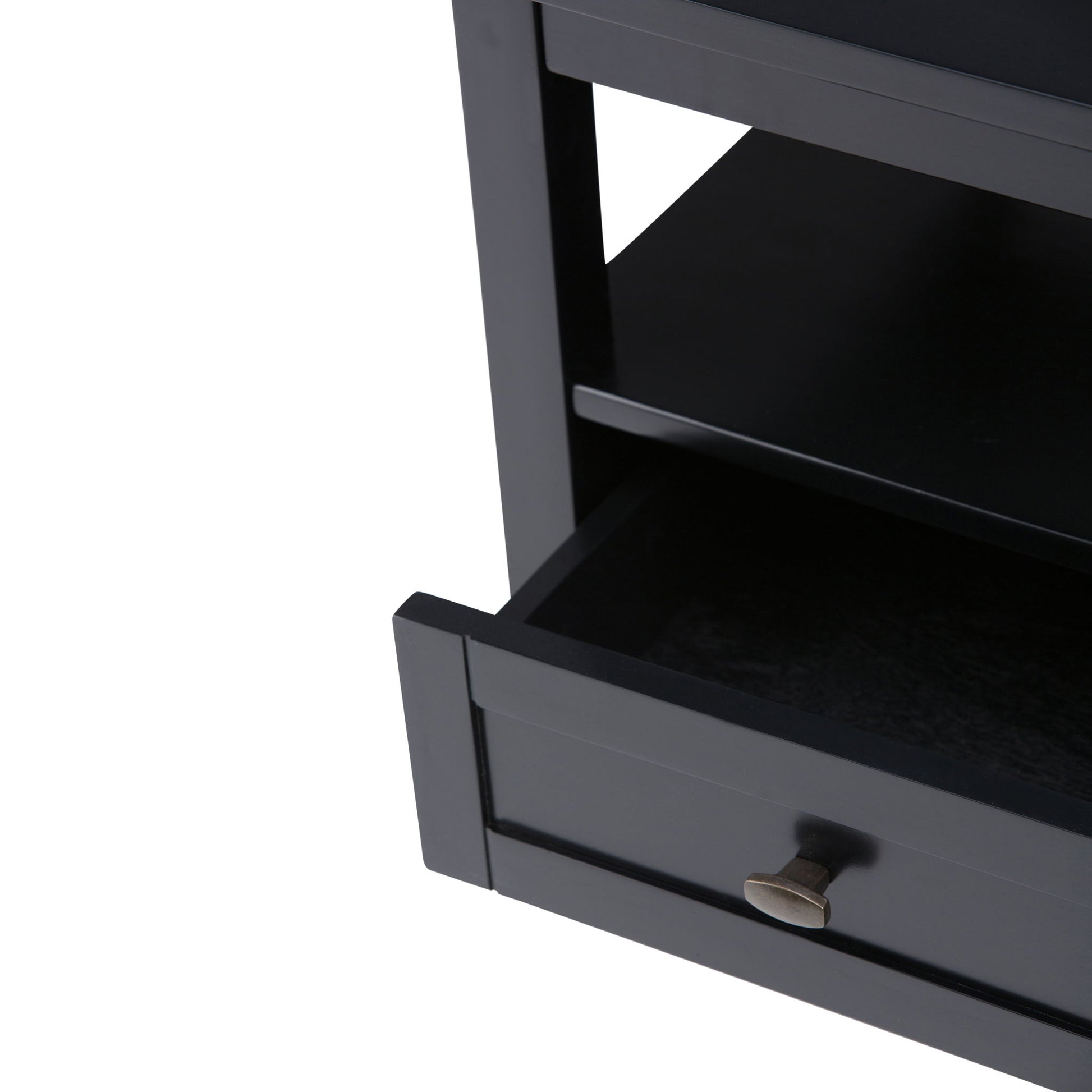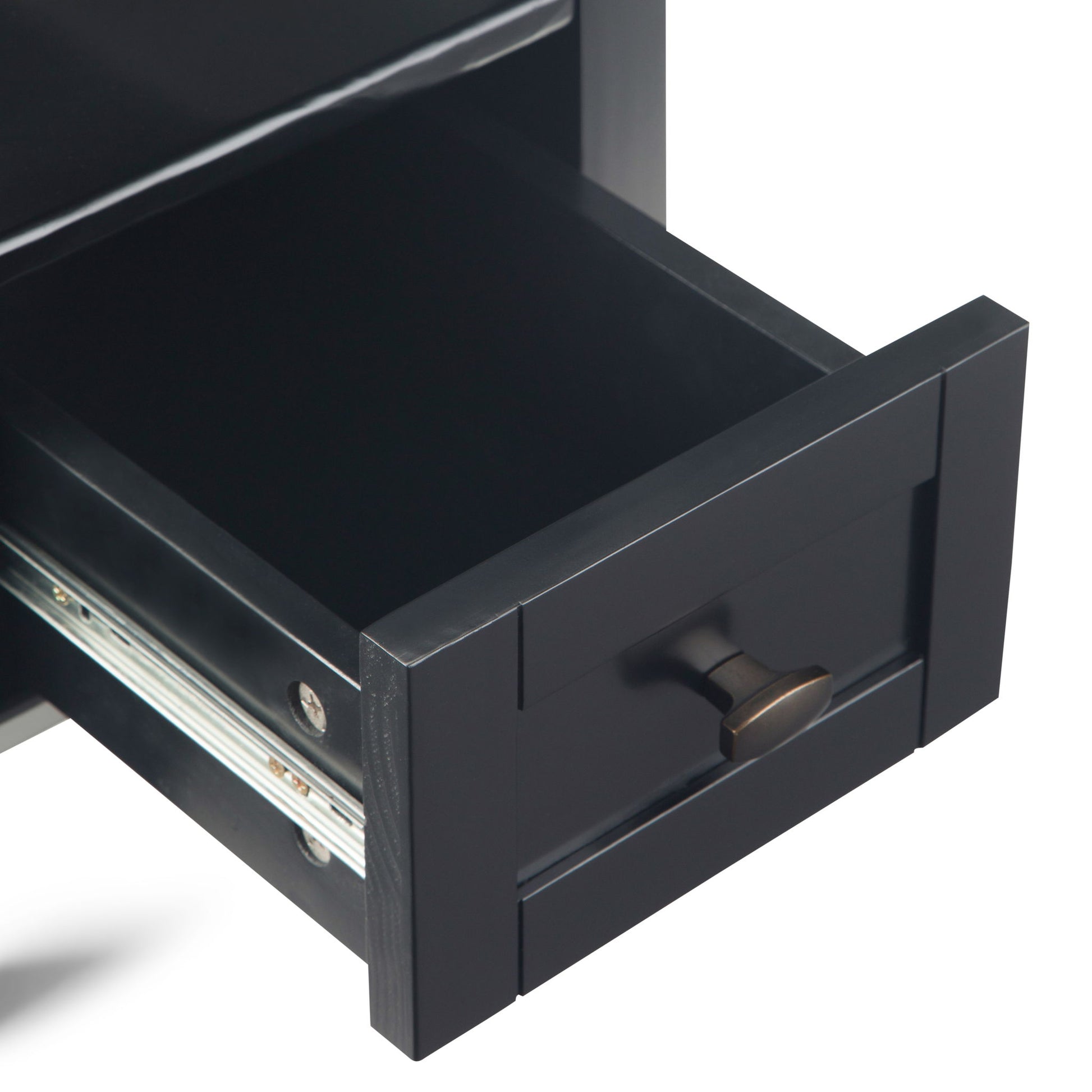 - Features bottom drawer with metal drawer glides and large open shelf for storage